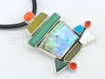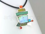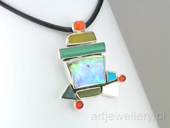 9100 Wisior: jadeit, kalcyt, agat, turkus, masa perłowa, cyrkonie, srebro, wys. 5,4cm, szer. 4,6cm. Pendant: jadeite, calcite, agate, turquoise, mother of pearl, zircons, silver, height 5,4cm, width 4,6cm.