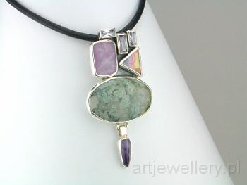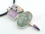 9102 Wisior: ametysty, agat mszysty, porcelana, cyrkonie, srebro, wys. 7,2cm, szer. 3,7cm. Pendant: amethysts, mossy agate, porcelain, zircons, silver, height 7,2cm, width 3,7cm.