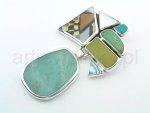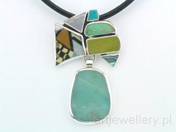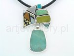 9148 Wisior: porcelana, turkus, chryzopraz, jadeit, masa perłowa, chalcedon, srebro, wys. 6,8cm, szer. 4,2cm. Pendant: porcelain, turquoise, chrysoprase, jadeite, mother of pearl, chalcedony, silver, height 6,8cm, width 4,2cm.